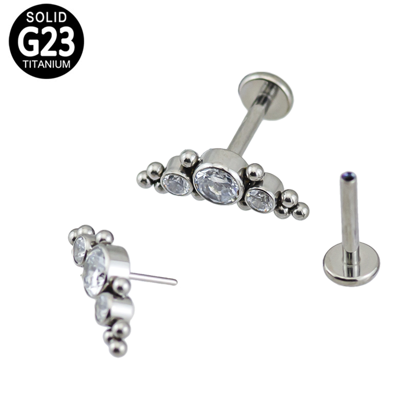 G23 Titanium Push in 3 CZ Blaze Set With Clustered Tribal Beads Tops Labret